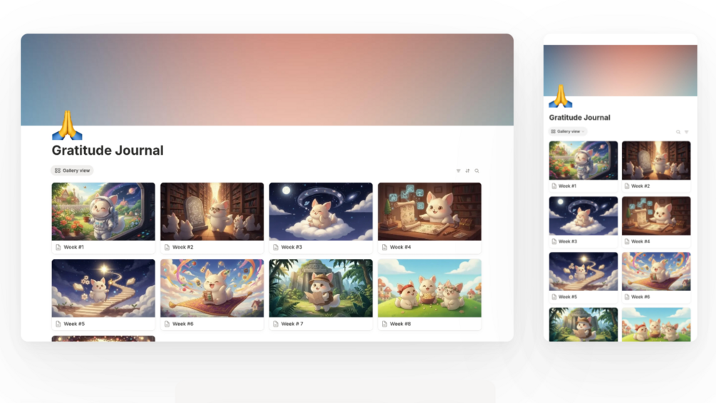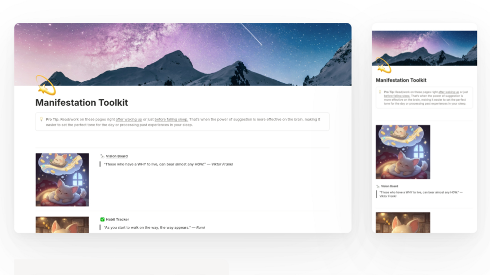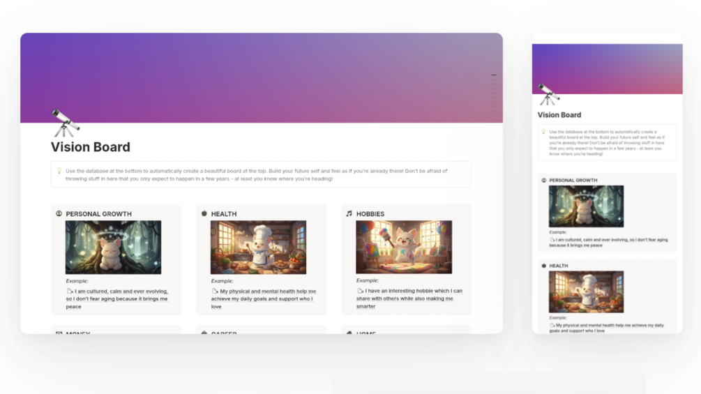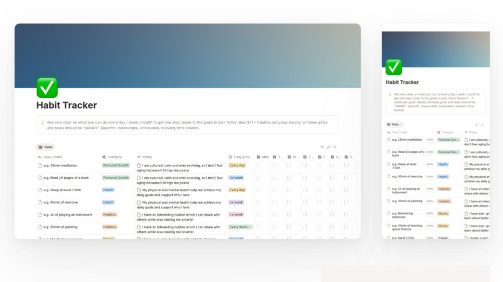 From visualization to actual daily steps, this toolkit helps you save time while trying to get closer to your dream self and your goals. It includes a vision board, a habit tracker and a gratitude journal, all interconnected through a database and a calendar.