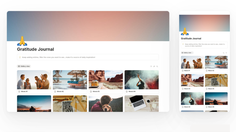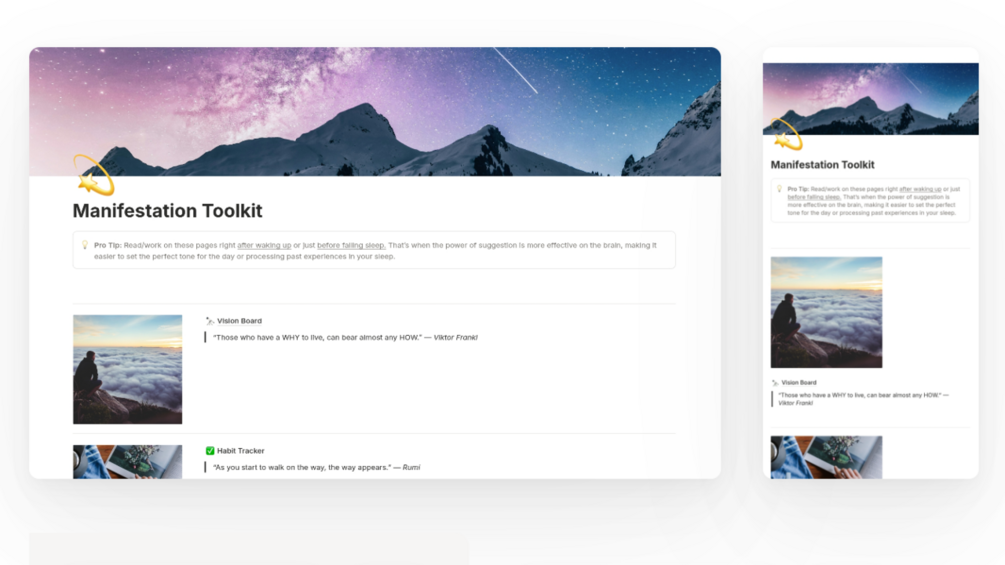 From visualization to actual daily steps, this toolkit helps you save time while trying to get closer to your dream self and your goals. It includes a vision board, a habit tracker and a gratitude journal, all interconnected through a database and a calendar.